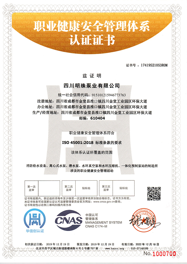 职业健康管理体系认证证书