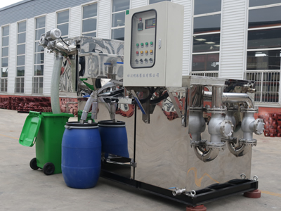 设备总入口连接污油水总管,废水可分两路进入隔油提升设备内,废水中的杂物被分离在除渣装置中,废水和油脂进入油水分离仓,水位上升到一定位置,利用油水密度差原理将油脂收集到浮油收集区,通过放油阀将油排至废油收集桶,而油水分离仓内分离后的废水在液压的作用下流入储水箱,当储水箱内水位达到一定位置时,水泵将废水和储存在固液分离装置中的杂物一并排出。